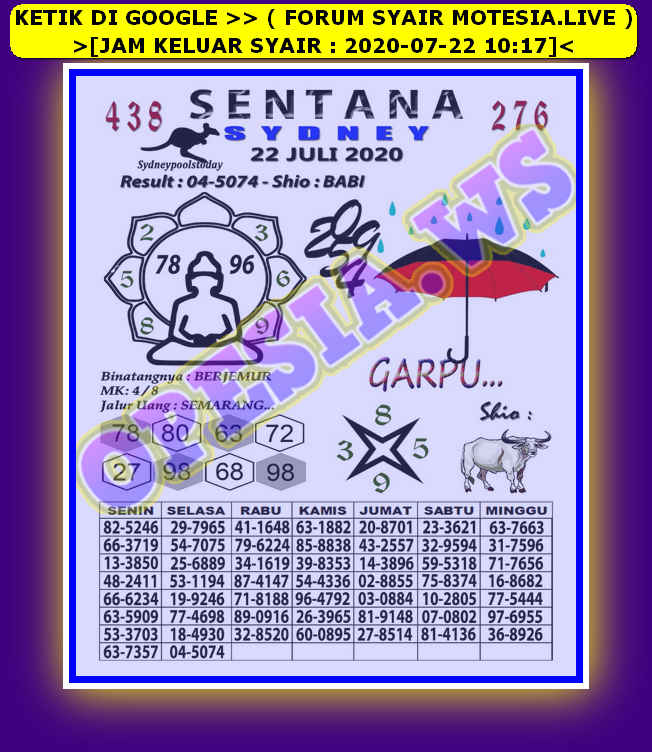 Syair Sidney Hari Ini Rabu 22-07-2020 Syair togel adalah salah satu gambar atau alat yang biasanya digunakan untuk memprediksi nomor yang akan keluar Syair bisa diartikan sebagai rangkuman prediksi Shio atau ramalan shio.
