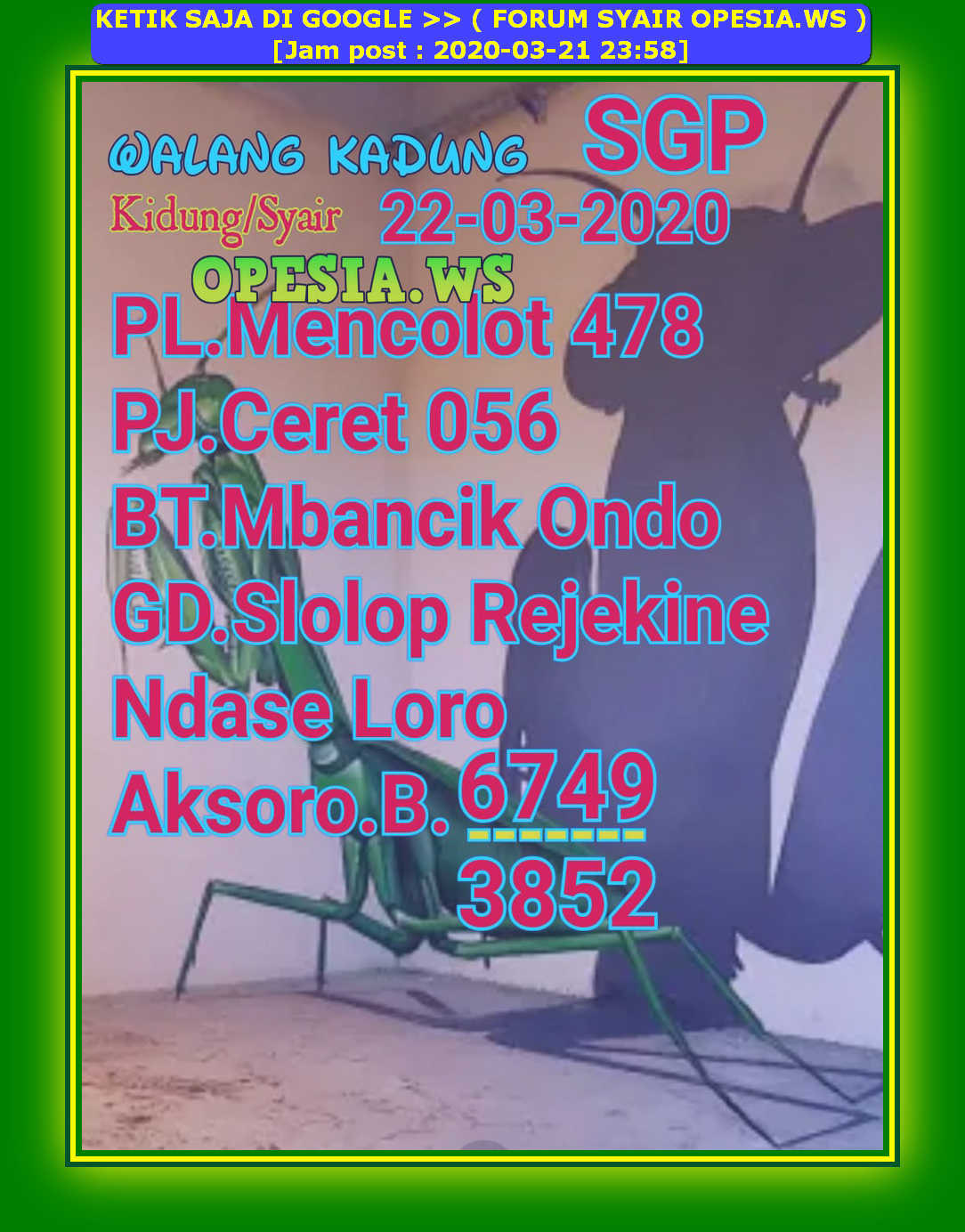 Syair Sgp Opesia 22 Maret 2022. Hallo sahabat setia pengunjung web prediksi Kode Syair Pak Tuntung. Prediksi Togel hari ini Anda Diharap Fokus pada. Pencari angka jitu Ramalan Si Mbah Lontong tiap hari kami ingatkan bahwa kode Bergambar dibawah ini berlaku untuk 3 pasaran sekaligus Pasaran Singapore pools sgp Hongkong pools Hk Sydney pools Sdy. Syair HK 22 Maret 2021 prediksi hk 22 Maret 2021 forum syair hk hari ini kode syair hk prediksi hk hari ini prediksi hk jitu dan tercepat dari UBERTOTO.
